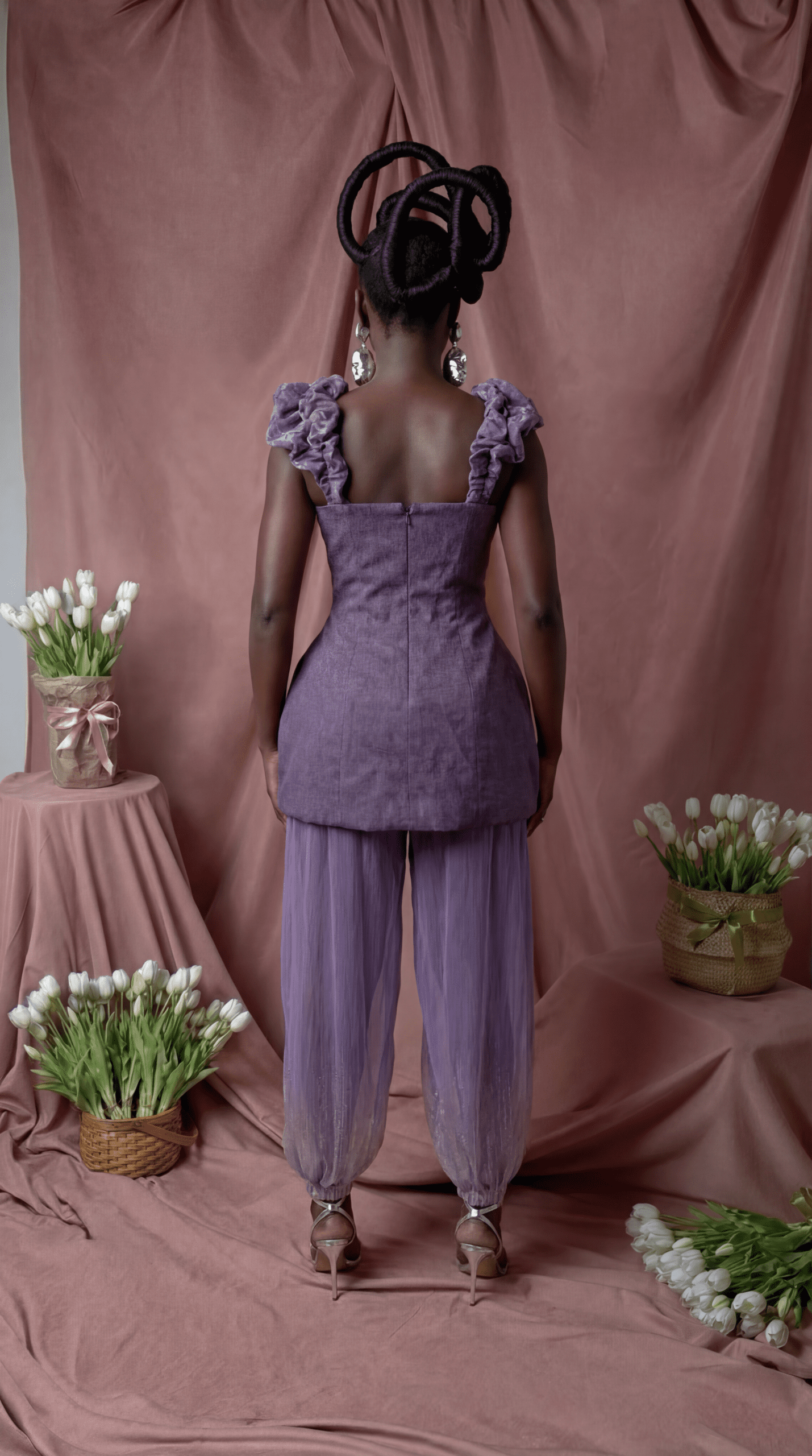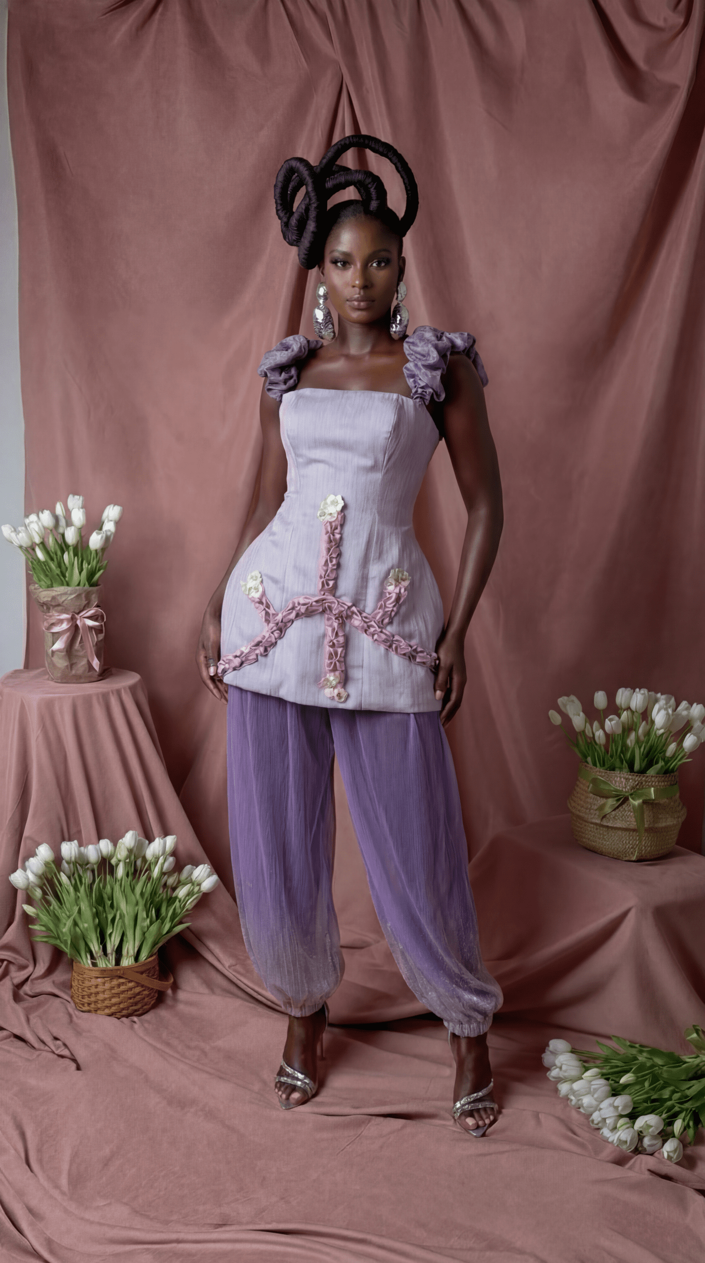 Is a sculpted statement of soft elegance and bold artistry. Designed with a structured bodice, delicate ruffled straps, and intricate floral-pleated ORIGAMI detailing, it flatters the silhouette while adding a touch of femininity. Finished in a dreamy lilac hue, it’s perfect for standout occasions with effortless grace.