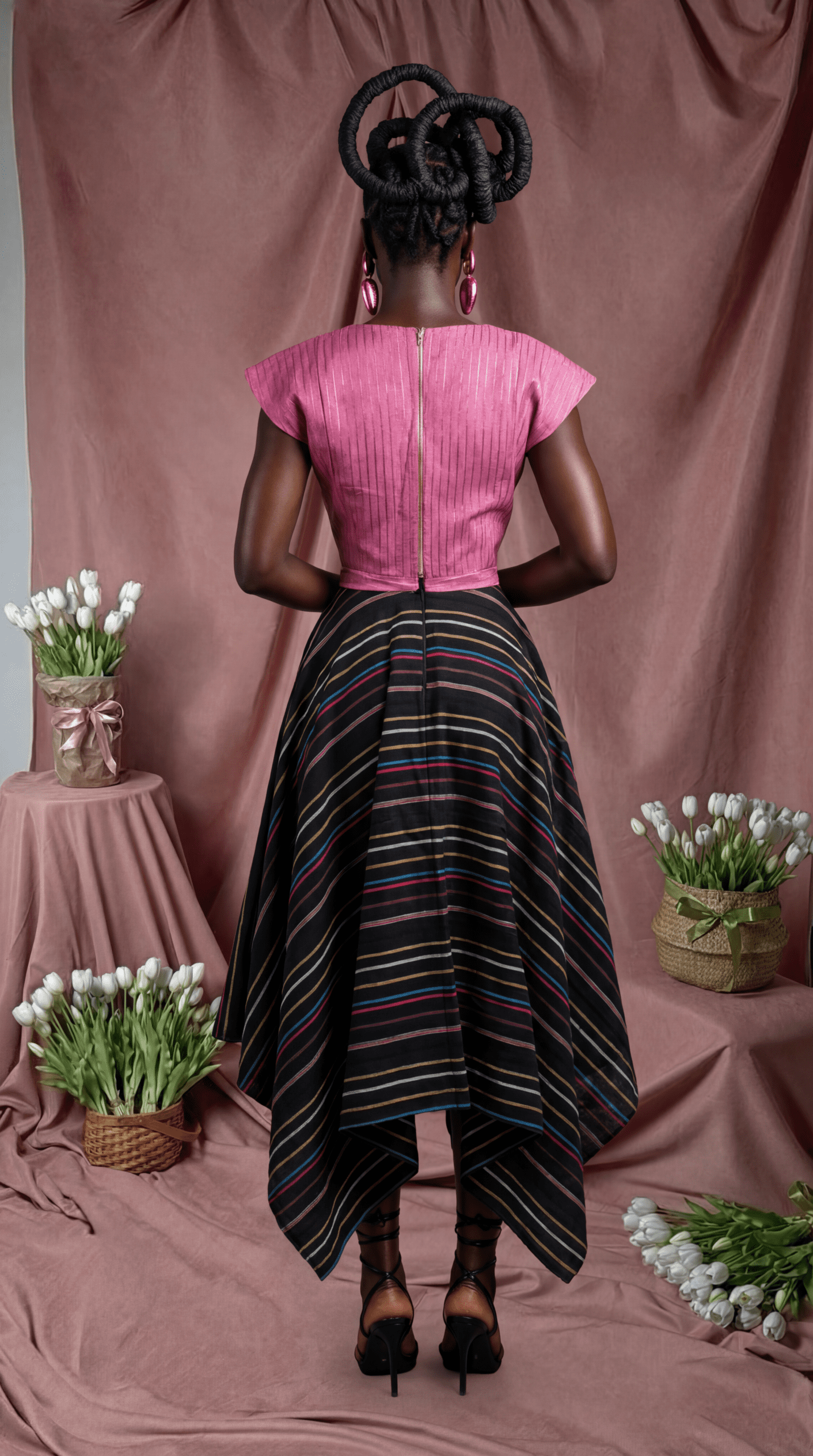 Fahari Skirt Is a voluminous Tea length square flare silhouette in a rich striped Handwoven Ase Oke, elevated by a sculpted pleated peplum waist and elongated panel accents that create graceful movement with every step.