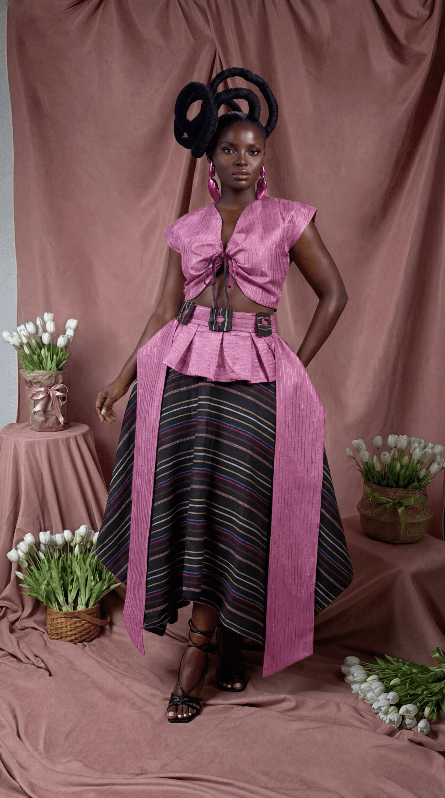 The Fahari Set is a refined expression of feminine structure and fluidity. The cropped Fahari Top features a soft V-neckline with a delicate front tie detail, crafted in a textured blush pink Ase Oke fabric that adds subtle sheen and dimension.