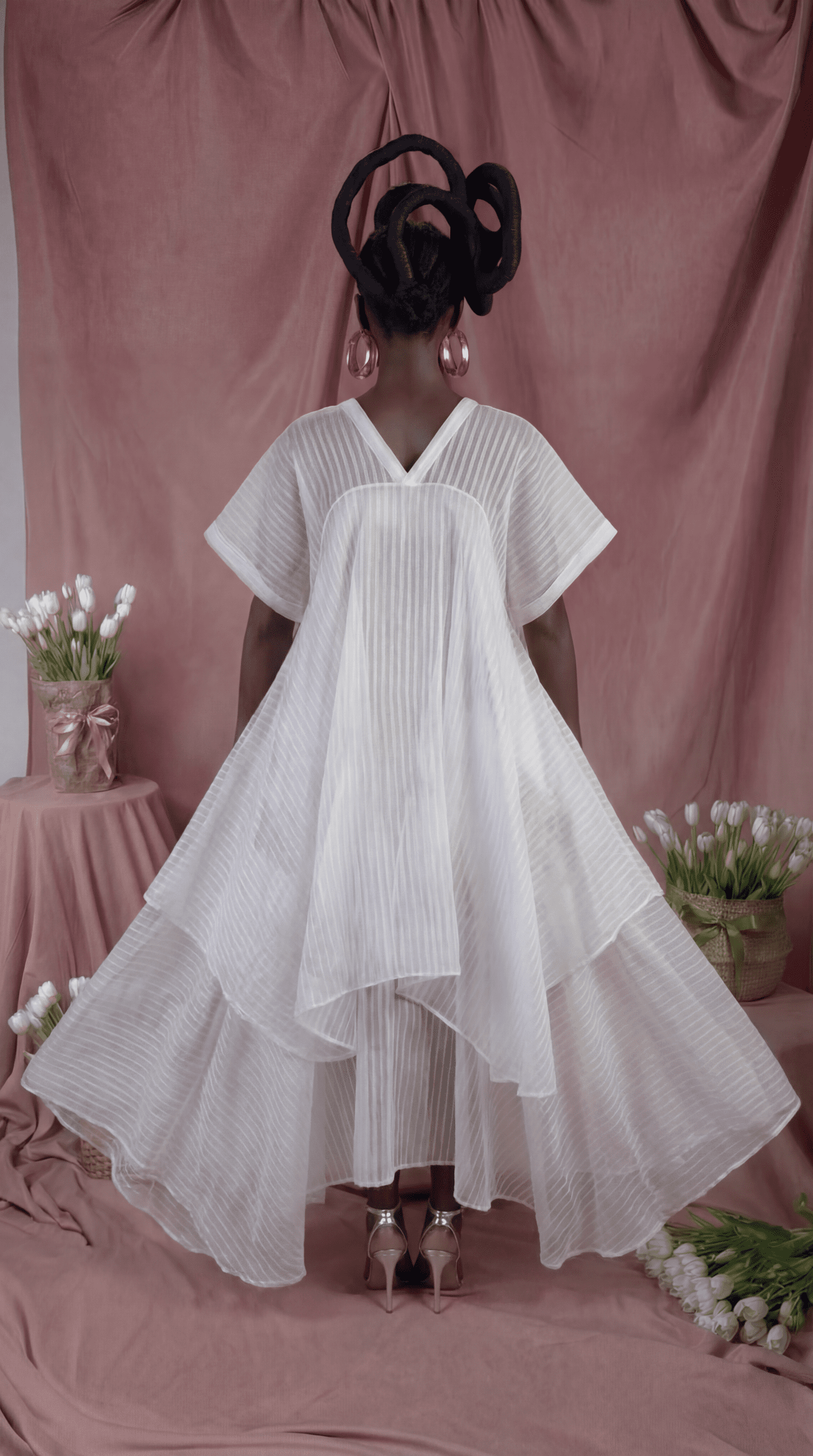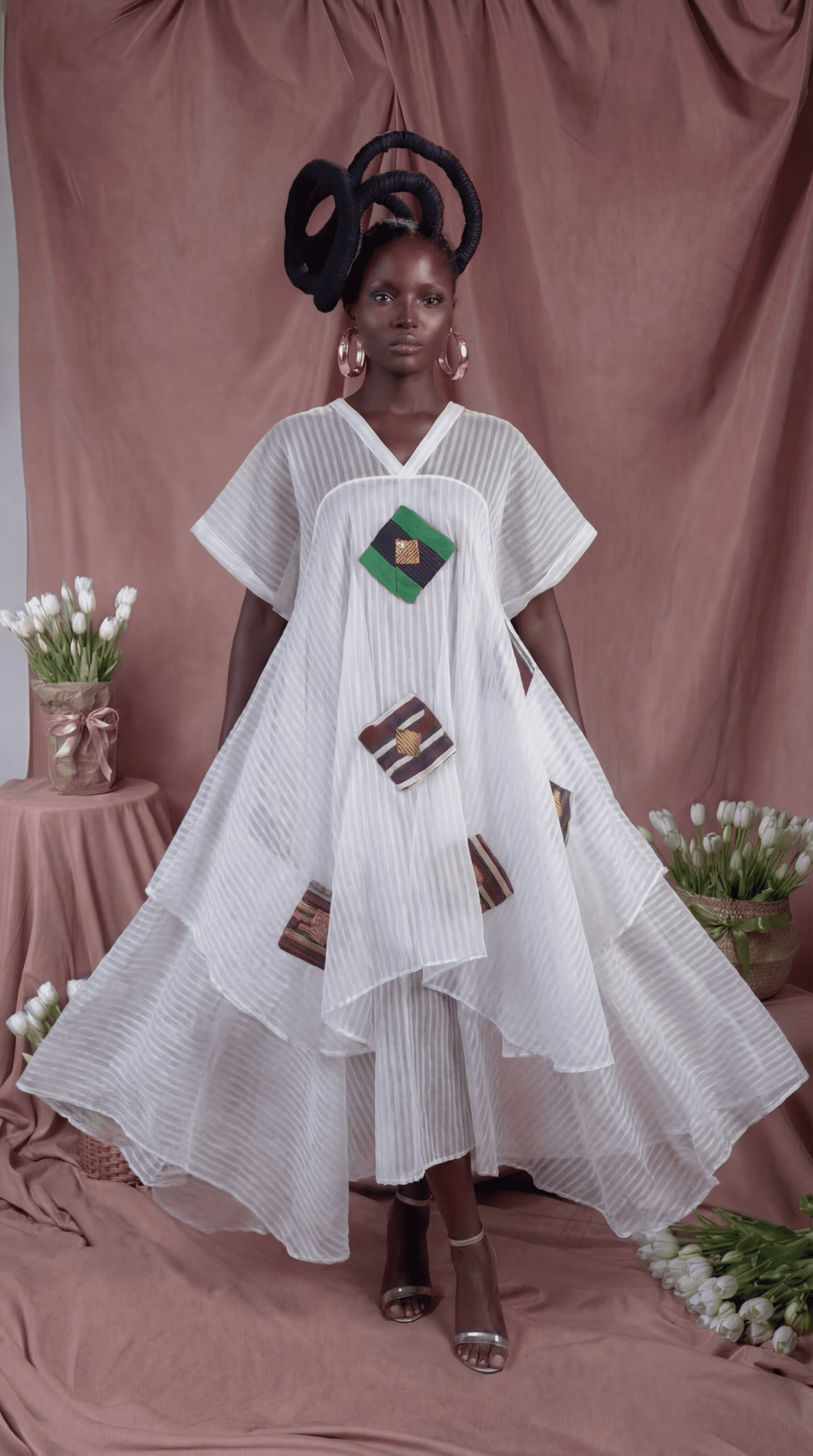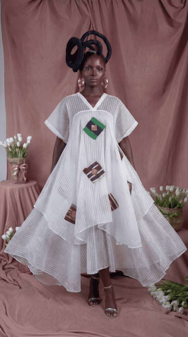 Is a statement in effortless elegance. Crafted from Seersucker organza fabric, it features a flowing 2 tier square flare silhouette with hand-placed diamond origami patchwork  that add a touch of artistry—light, airy, and perfect for refined standout moments.