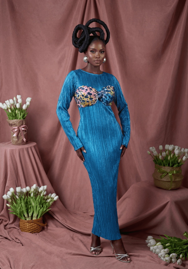 Is a sleek, body-skimming maxi crafted from lustrous pleated fabric. Featuring a striking abstract-print bust detail, it blends modern artistry with timeless elegance—perfect for making a statement at any special occasion.