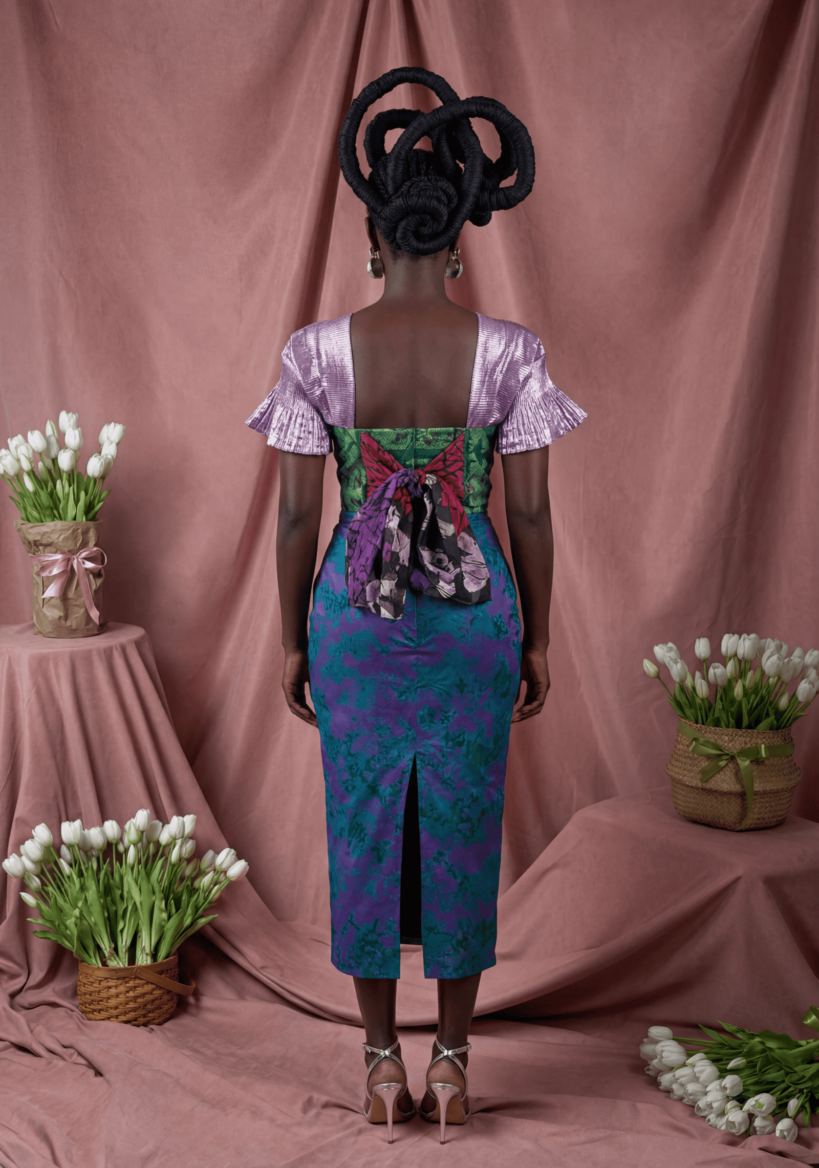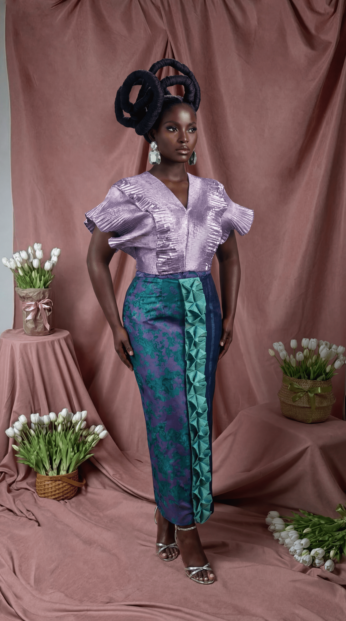 Is a sleek, high-waisted piece crafted from richly textured Ase Oke fabric in deep jewel tones. Featuring