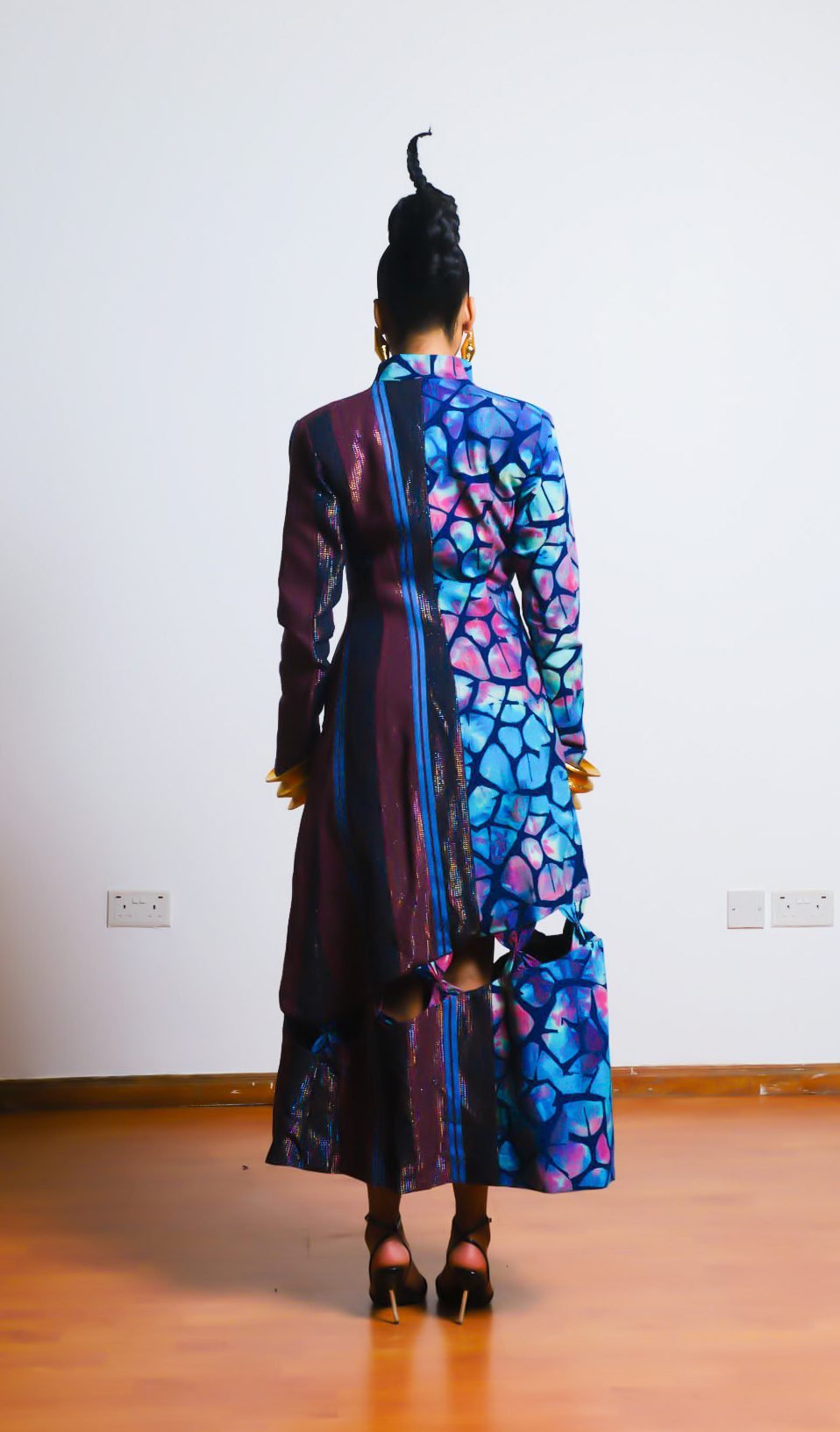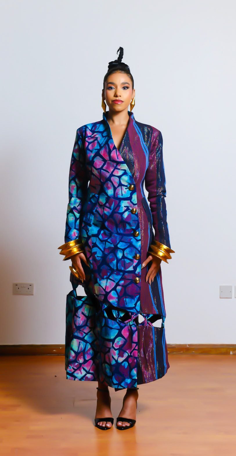 Tomike Trench Coat is an all in one standing collar button down long trench coat with cutout origami bows at midi section.